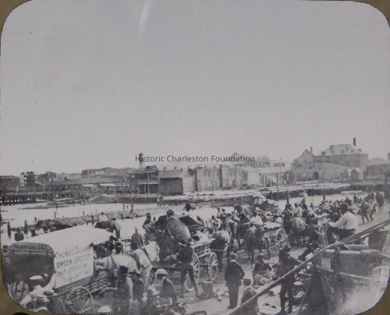 Photograph (magic lantern slide) showing a crowd gathered at a wharf. The slide is captioned "View at Wharf Charleston Prior to Departure of Grand Duchess." The steamship La Grande Duchesse ran between New York and Charleston. At the lower left is a wagon that says "Thomas Duggan, Green Grocer, Ship Stores," which was located at 111 East Bay Street. Several buildings in the vicinity of the wharf are in the background, including Vanderhorst Row (78 East Bay) at right and the old Carolina Yacht Club in the center.