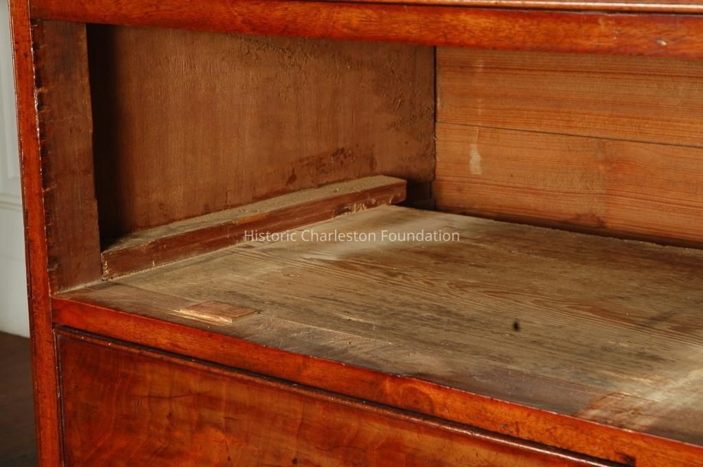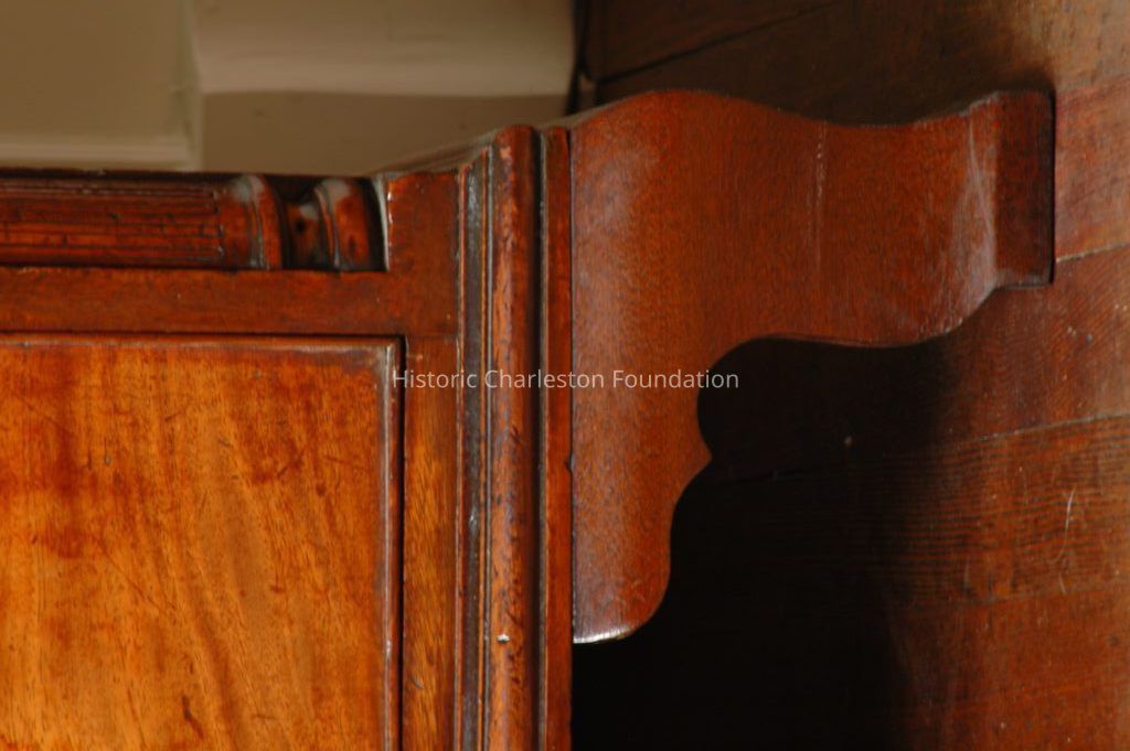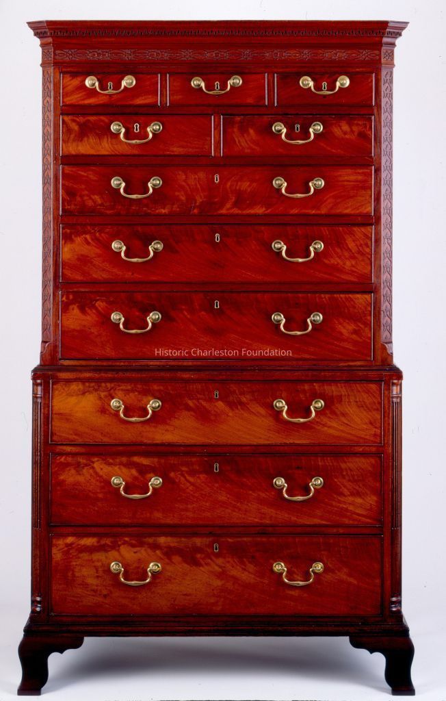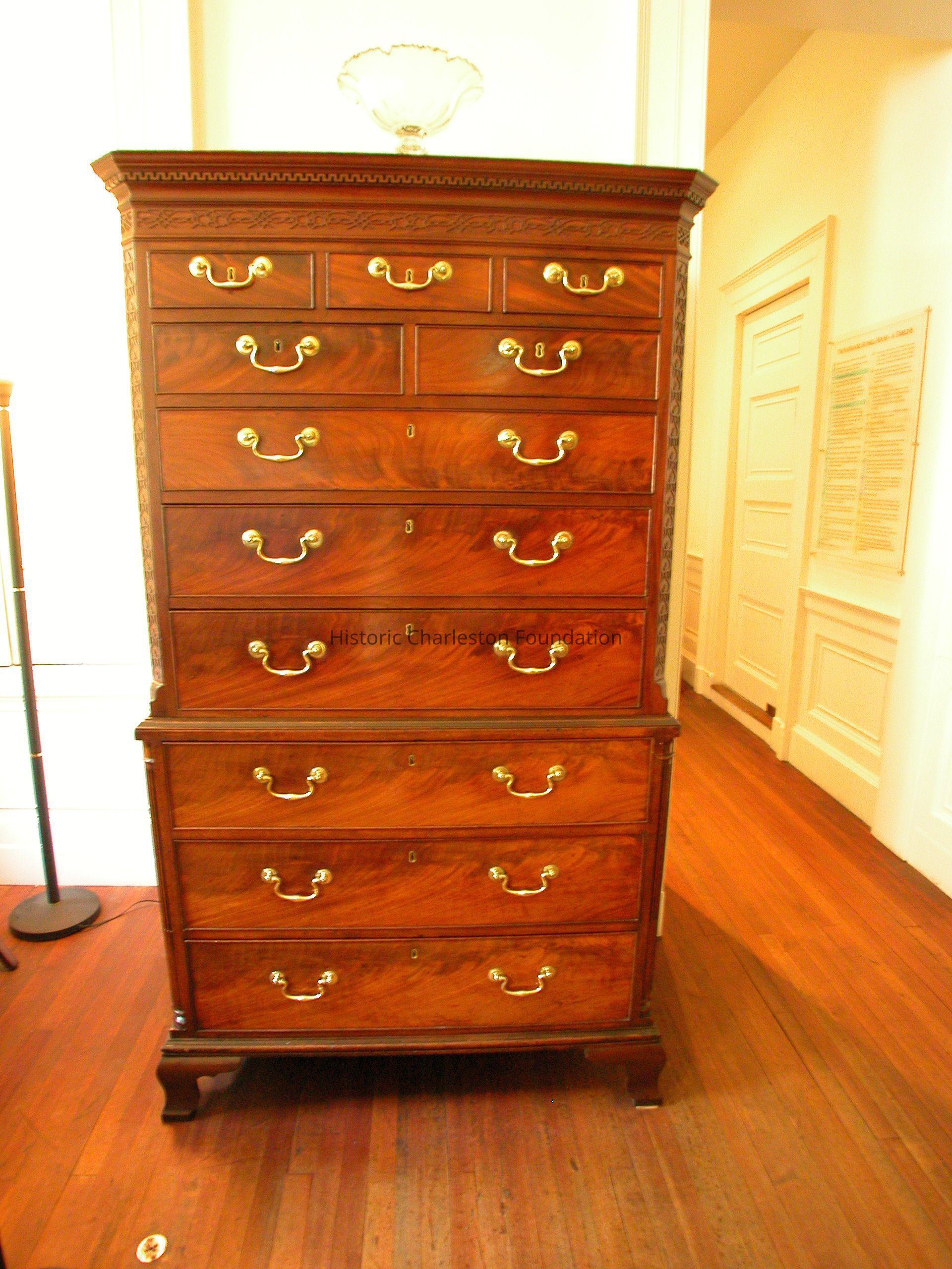 Chest-on-Chest made of mahogany with mahogany veneer. Cypress and mahogany secondary woods. Chippendale/Rococo style, c. 1770. Origin: Charleston, SC. Descended in the Frost family.