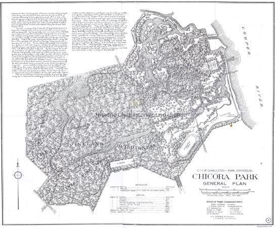 Chicora Park General Plan drawn by the Olmsted Brothers for the City of Charleston Park Commission, April 18, 1899. Includes extensive explanation notes, names of Board of Park Commissioners, descriptions of distances and areas. Published by the Heliotype Printing Co.