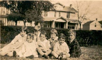 B&W photograph of seven children seated on a lawn. 518 Huger Street is in background. The detached, two-story garage/servants' quarters is visible at the right.Context