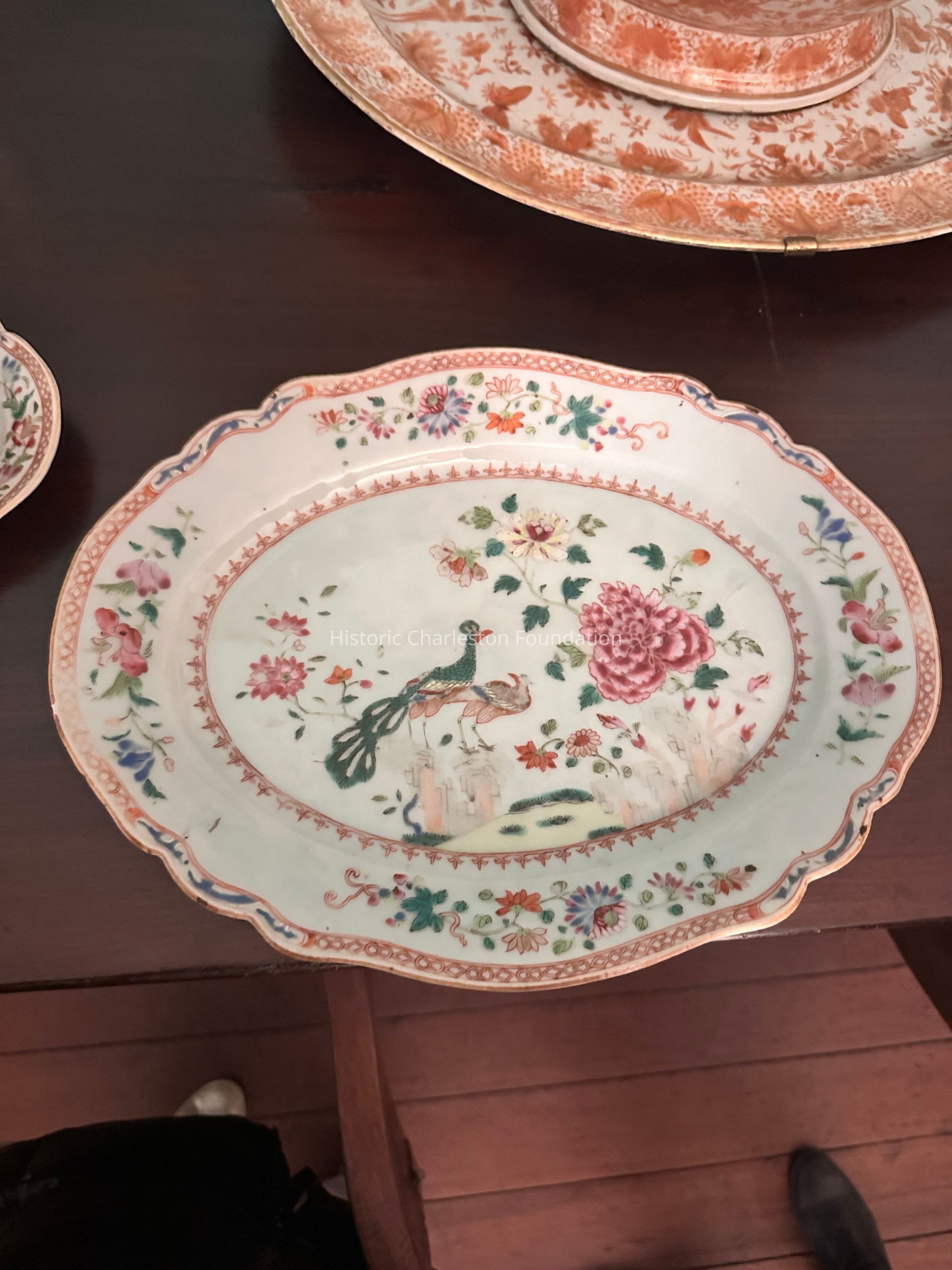 Chinese Export Platter C.1770. Oval with Scalloped Edges, Peacock Pattern W. Brown, Green, Yellow, Rose, Blue and Gold Pea Fowl Perched on Salmon and Grisaille Rocks Amidst Peonies and Green Foliage. Red Gilt Spearhead Border W. Blue Dragon Panes At the Edge.Collection