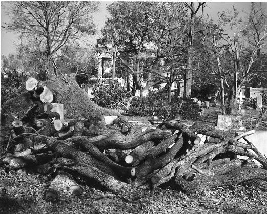 B&W photograph of a church graveyard after Hurricane Hugo.Collection