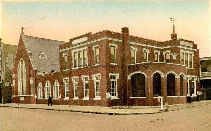 Hand-colored postcard of the Church of the Redeemer and the Harriot Pinckney Home for Seamen, located at the northwest corner of Market and East Bay Streets (34 North Market Street).
