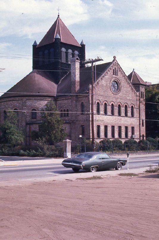 Ektachrome color slide of the Circular Church (150 Meeting), taken from what was an empty lot at the corner of Meeting and Horlbeck Alley. Shows the north and west elevations.
