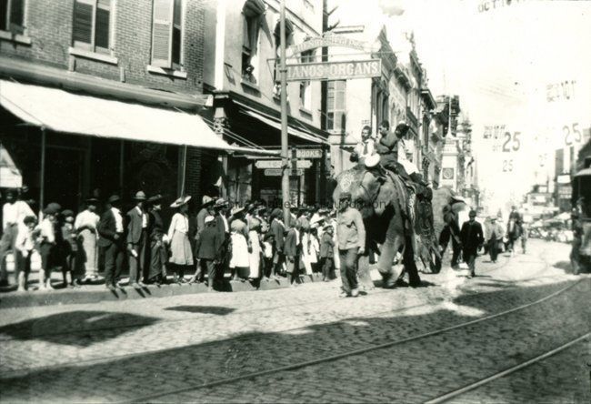 B&W photograph of a parade of elephants on King Street, here for the Walter L. Main Circus. Shows the view north on King Street from the Siegling Music House (foreground) (243 King Street). Crowds are on the sidewalk watching the elephants as they walk down the street. The parade occurred on September 10, 1926.Collection