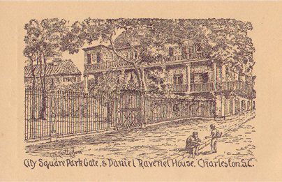 Entrance gate at City Square Park (now known as Washington Park) and the Daniel Ravenel House (69 Broad Street) (drawing). Drawn by George F. Castleton