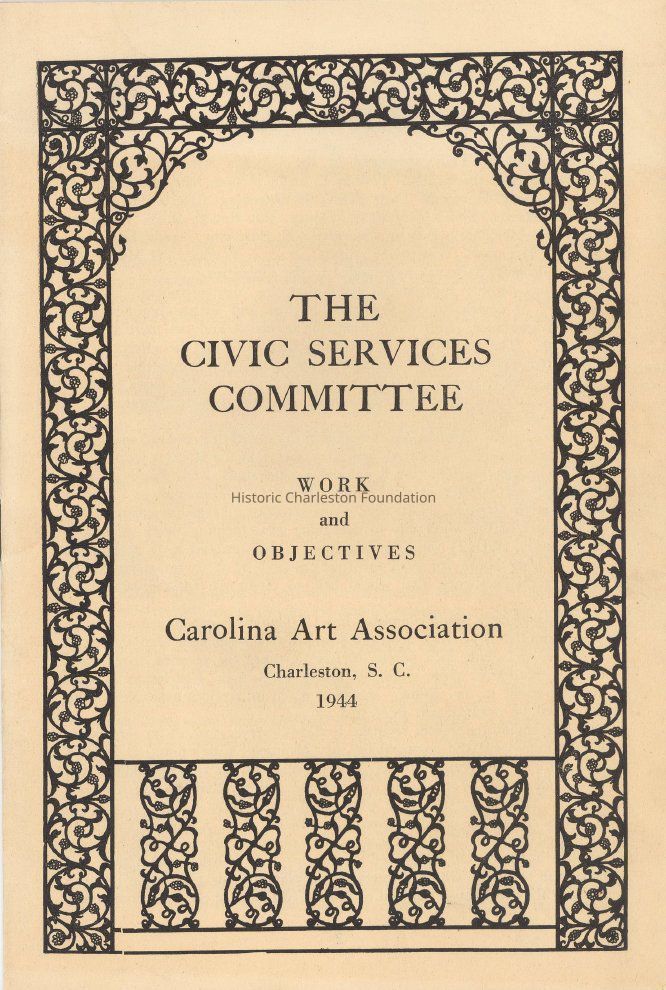 Minutes of meetings of the Civic Services Committee and miscellaneous reports and documentation including proposed Constitution for Historic Charleston Foundation; "Request to the Rockefeller Foundation for a Grant for the CSC"; letter from Frederick H. McDonald regarding Program for Civic Services Committee; report entitled "Planning in Charleston" outlining early urban planning efforts in Charleston and issues facing the CSC; the visit to Charleston by Kenneth Chorley and his address to the CSC "The Challenge to Charleston"; the publication of This Is Charleston; the report to the CSC by Mr. Whitelaw that outlines the need to create a preservation organization; and the report of the Committee to Consider Arrangement of Tours of Old Houses for HCF outlining the plan to conduct tours.