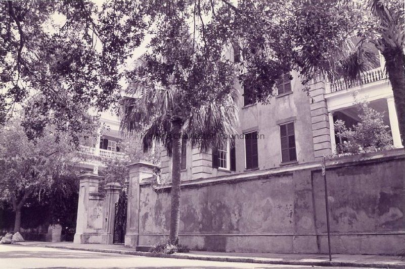 B&W photograph of the Cleland Kinloch Huger House (8 Legare Street), west (front) elevation. View of house is minimal; partially obscured by trees and by the stucco wall in front.