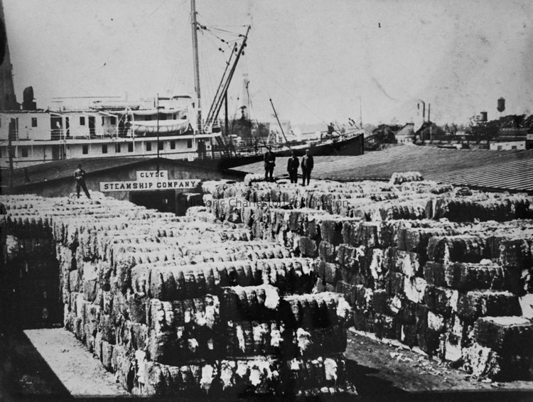 B&W photograph (scan) of the Clyde Line Steamship Company dock, located at the foot of Vendue Range at Concord Street, where Waterfront Park is today. What appears to be bales of cotton are stacked in the foreground in front of a "Clyde Steamship Company" structure. Four men stand on top of the bales. Ships and nearby buildings in the background.Collection