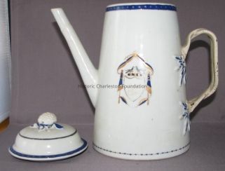 Coffee pot, chinese export, 18th century. Ammorial ware, lighthouse-shaped body with domed cover having berry and leaf finial, cobalt blue with gold star border over gilt and cobalt ribbon mantle with swag above pair black birds over shield-shaped cartouche with red monogram'LL', having reeded and twisted ribbon handles attaced to body with blue leaf design.Collection