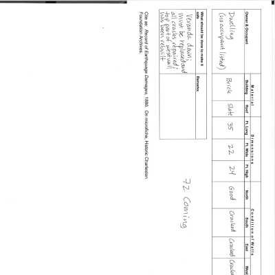 Damage assessments for the 1886 Earthquake and Hurricane Hugo for 70, and 72 Coming Street on Media tab.Created By