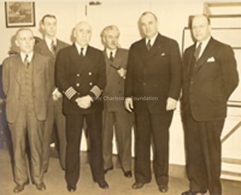 Photograph of Edward H. Robertson, chairman of the Charleston County Board of Commissioners; Robert N.S. Whitelaw, director of the Carolina Art Association; Capt. G.E. Baker, acting commandant of the Charleston Navy Yard; Frederick H. McDonald, consultant to the Civic Services Committee; Mayor Henry W. Lockwood; and Ernest L. Godshalk, president of the Charleston Chamber of Commerce.Context