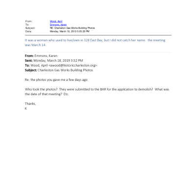 Six color photographs documenting the conditions of the Charleston Gas Light Company/Charleston Gas Works (1 Charlotte Street) submitted to the BAR on March 14, 2019 in opposition to a request for demolition (denied).