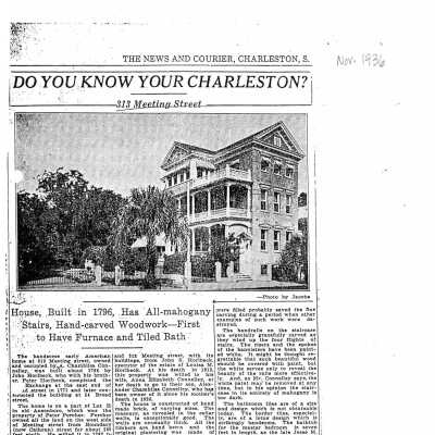 Three files contain documentation of the easement on the property including related correspondence and Confirmation of Understanding; Part I certification (National Register); easement appraisal report; IRS form 8283; annual inspection reports, requests for alterations, and correspondence related to the management of the property; newspaper articles (including 1936 DYKYC); photocopies of photographs (sources and dates not indicated); photocopy of J.M. Connelley Greenhouses letterhead engraving, ca. 1800s; photocopy of bill from J.M. Connelley, Furnishing Undertaker and Practical Embalmer, with office and warerooms at 143 Calhoun Street (dated 5/1/1887); newspaper article and correspondence from Preservation Society and SCDAH regarding piazza enclosures and proposed renovation of 313 Meeting into condominiums.