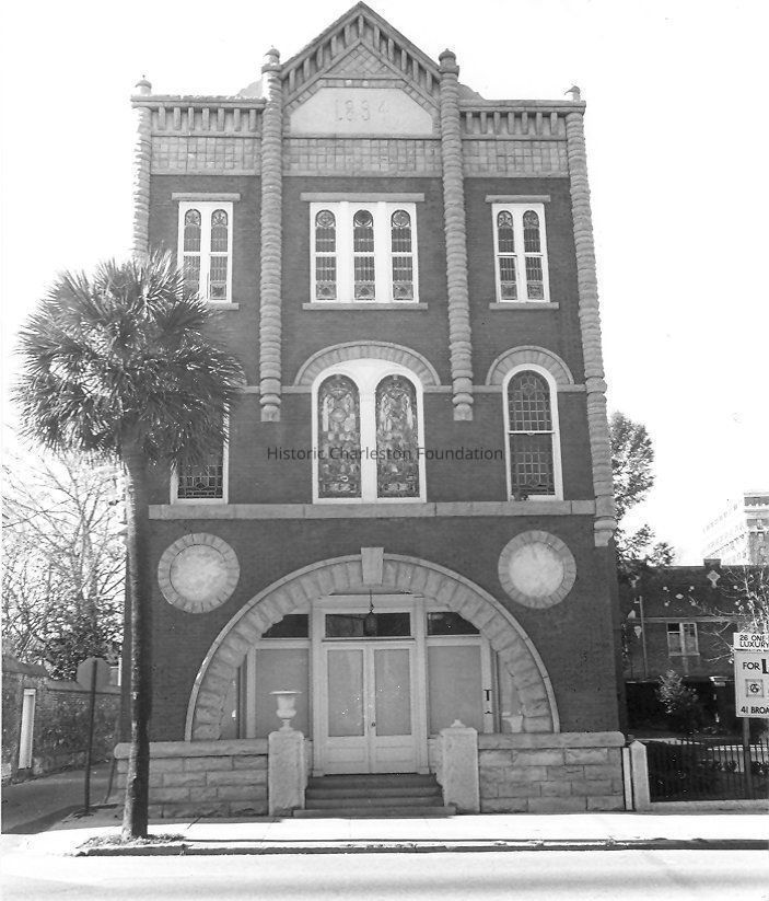 House constructed circa 1796; renovated 1890s. Funeral home constructed 1894; complex rehabilitated as residential condominiums 1984. The Charleston single house at 313 Meeting Street was built about 1796 by John Horlbeck on that portion of the original Ansonborough suburb formerly owned by Peter Porcher. Though the house is said to retain much of its original interior woodwork, its exterior was heavily altered with Eastlake/Victorian style alterations after its purchase by Jesse M. Connelley in 1892. Connelley, an Edgefield businessman and salesman, purchased an undertaking business from Frederick Ansel and retained the builder J. D. Murphy to design and construct a new Romanesque Revival style mortuary in 1894 at 309 Meeting Street. This structure's facade, including sandstone detailing and stained glass windows, is essentially original to construction. Connelley also established Charleston Greenhouses on the site, selling tropical fish from a small outdoor aquarium, which partially survives in front of the greenhouses. Connelley also completed a large brick coffin warehouse at the rear of the site, a structure now facing Burns Lane. Connelley became South Carolina's first licensed mortician, when such laws were enacted early in the 20th century, and operated the leading funeral home serving Charleston's elite families for several generations. In 1984 a group of Atlanta investors rehabilitated the house and mortuary as condominiums, retaining their exterior appearances and much of their interiors as well. The former coffin warehouse at Burns Lane/143 Calhoun Street now serves as a maintenance facility for the College of Charleston. (Poston, Buildings of Charleston.)
