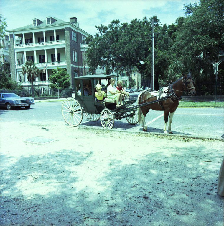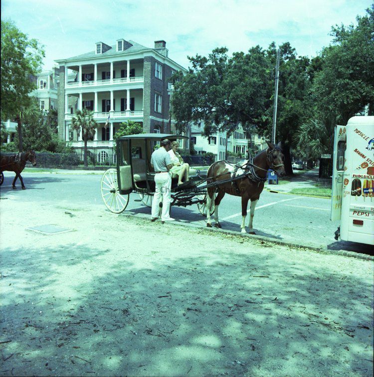 1-2) Horse-drawn carriage on South Battery, with 1 Meeting Street in background (ice cream truck in photo)
