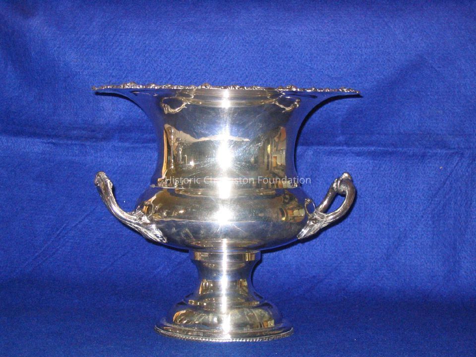 Wine cooler, silver, urn-shaped, having flared rim with grape and leaf rim, bracket grape and leaf decorated handles, on domed circular base.Collection