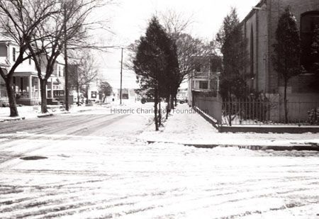B&W photograph (scan) showing the corner of Fishburne and St. Philip looking east to King Street, taken ca. 1942.Context
