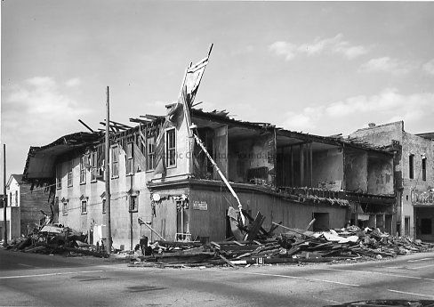 B&W photograph of the corner of King Street and Spring Street showing the damage done to the building by Hurricane Hugo. A portion of the Lincoln Theater (601 King Street) is visible at right.Collection