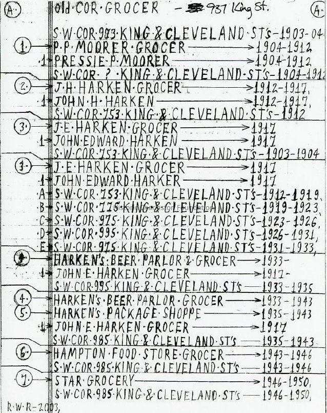 Three lists of Charleston corner stores. Lists 1 was compiled in 2003 by local artist Ronald W. Ramsey and features a list of 13 corner stores by address, intersection, shop owner, and years in business.