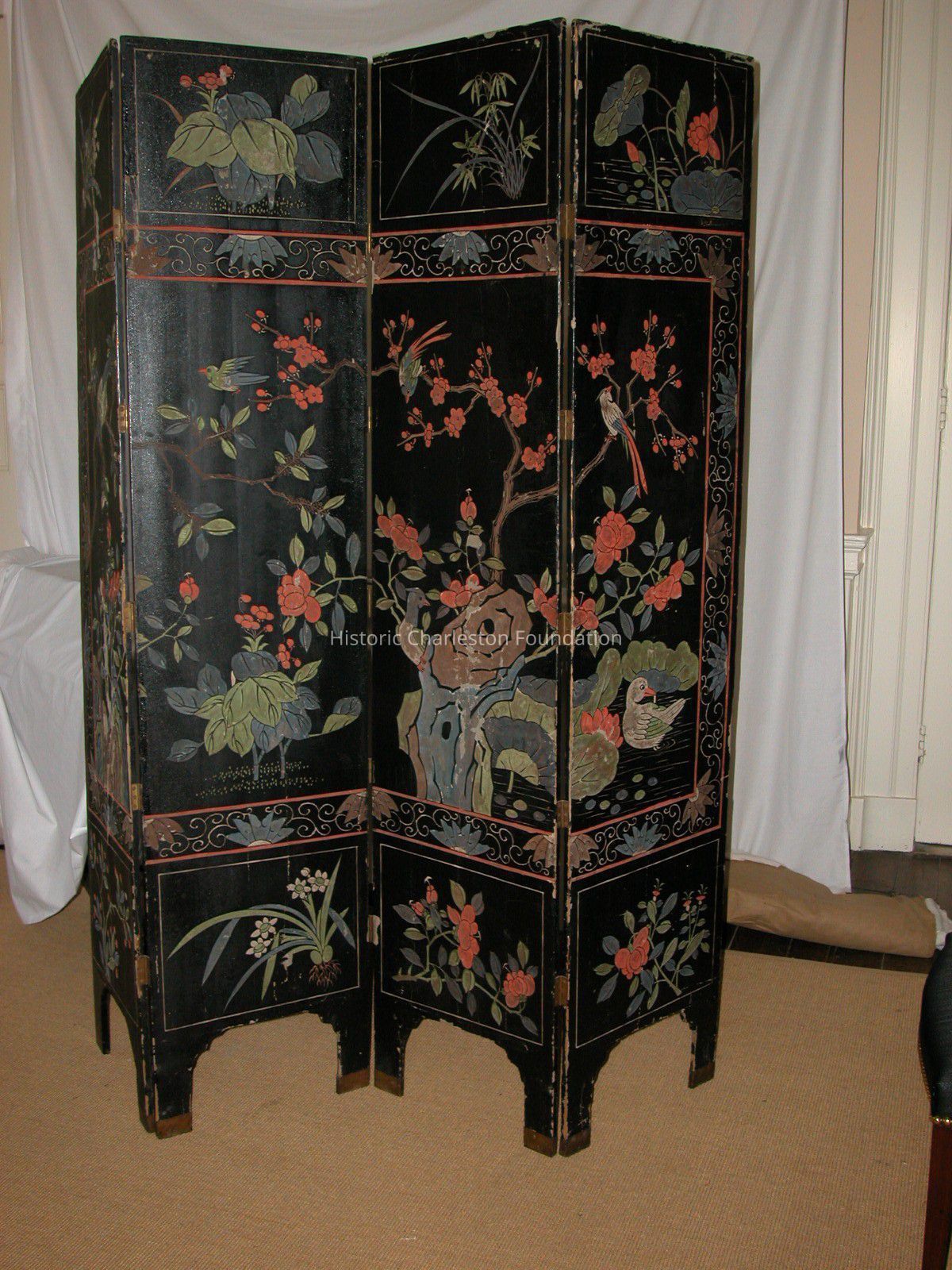 Four Panel Coromandel Screen, Probably 19th C. One Side Depicts Branches with Flowers and Birds Surrounded By Border of Scrolls and Flowers. Reverse Depicts Oriental Buildings with Figures Within Abstract Border. Black Field with Red, Blue and Green Decoration.Collection