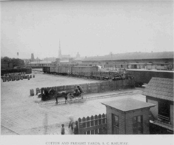 Photograph of the cotton and freight yards of the South Carolina Railway, viewed looking southwest from the corner of Mary and Meeting Streets. Horse-drawn carriage on street. St. Matthew's steeple in background. Railroad cars on the tracks, one hauling what appears to be lumber.Context