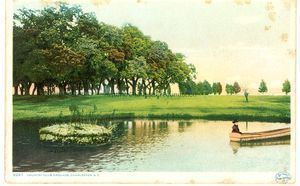 Postcard (scan) featuring a pond and the grounds of the Country Club (Belvedere-on-the-Cooper?). Woman in rowboat in the pond.Collection