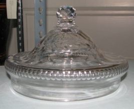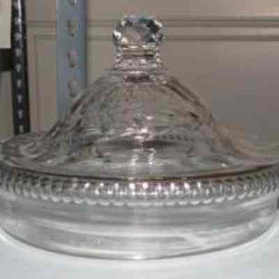 Circular Custard Bowl with Cover. Bottom of Bowl Is Facetted with Etched Leaf Band in Center and Vertical Oblong Facets Near Rim. Cover with Facetted Panels Top and Bottom with Etched Leaf Band. Facetted Finial Handle.Collection