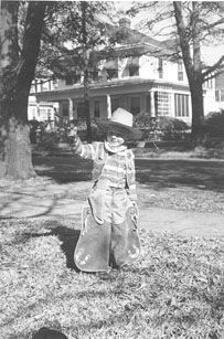 B&W photograph (scan) of a boy dressed as a cowboy, aiming his gun in the air.