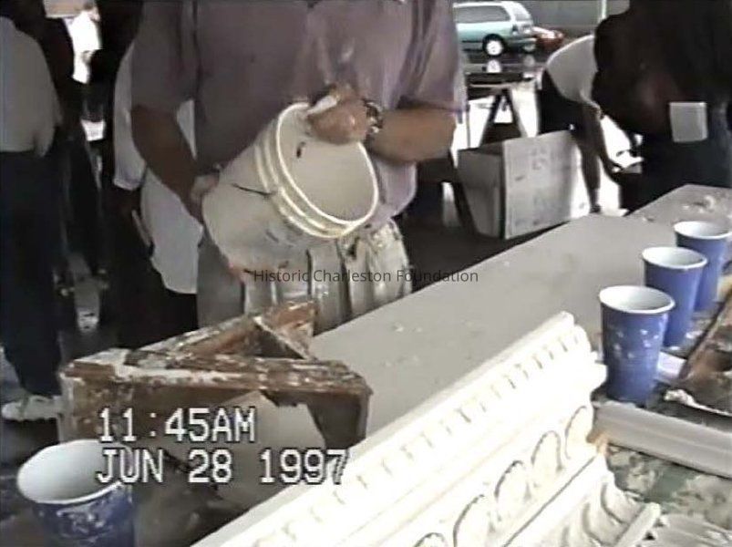 (1) Craft trades exhibition hosted by Historic Charleston Foundation on June 28, 1997. Hands-on work in various trades are demonstrated including woodwork (making rope mold, dowels, handrails), ironwork, panel door construction, marble refinishing, decorative plasterwork (David Hueske), and tabby restoration (interview only). Sound quality is very poor.