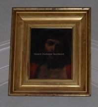 The painting is an oil on canvas. The canvas has been lined to a secondary fabric support with wax-resin adhesive. The orignal canvas is a medium tabby weave linen. The tacking edges are covered with paper tape. The stretcher has mitered joins and is not beveled on the reverse. there are no keys present. A layer of dust and grime covers the reverse of the painting. There is no protective backing on the reverse of the stretcher. The ground is off-white in color and is visible in the paint loss. The paint layer appears to be oil and is medium in application. The weave of hte canvas is apparent in the paint layer, possibly due to excessive pressure and/or heat from the previous lining procedure. there is no impasto in the paint layer. Medium size age and mechanical cracks are located throughout the ground and paint laers. There is no signature visible on the painting. There is a natural resin varnsih which has discolore and yellowed with age. It is not the original varnish as the painting has been restored. Proper left completely restored. Damage on side and only one eye original. The frame has been patched.