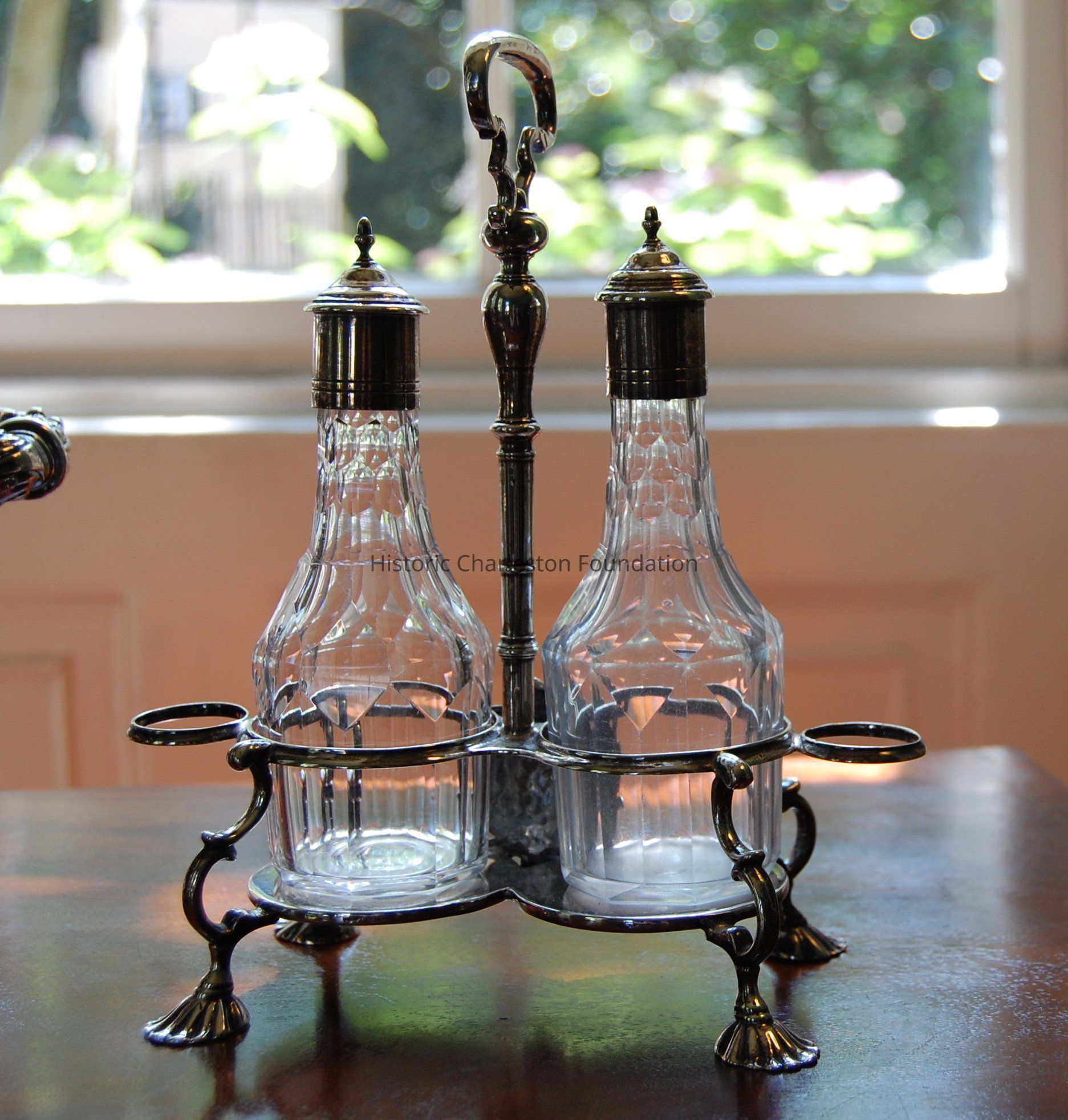 Silver Cruet Stand with Two Glass Cruets, By Samuel Wood, London, 1749-50. Consisting of a Flat Double Circle Plate on Four Shell Feet with Central Handle. Engraved Cartouche with Coat of Arms. Fiteted with Two Glass Cruets with Silver Covers. Two Silver Wire Rings To Accomodate the Cruet Covers When in Use. Fully Marked on Base.Collection
