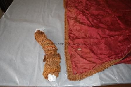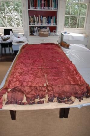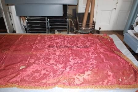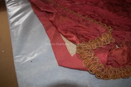 A. Red silk curtain panel with gold trim