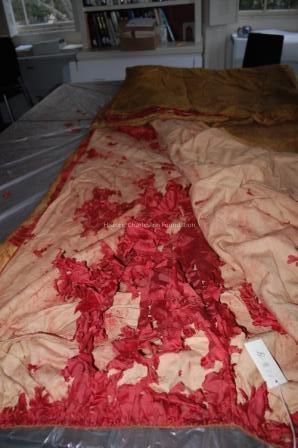 Top palion of curtain largely shattered red silk damask matching other curtain parts. Thought to be the largest curtain panel. Top of curtain gathered and metal rings reinforced.