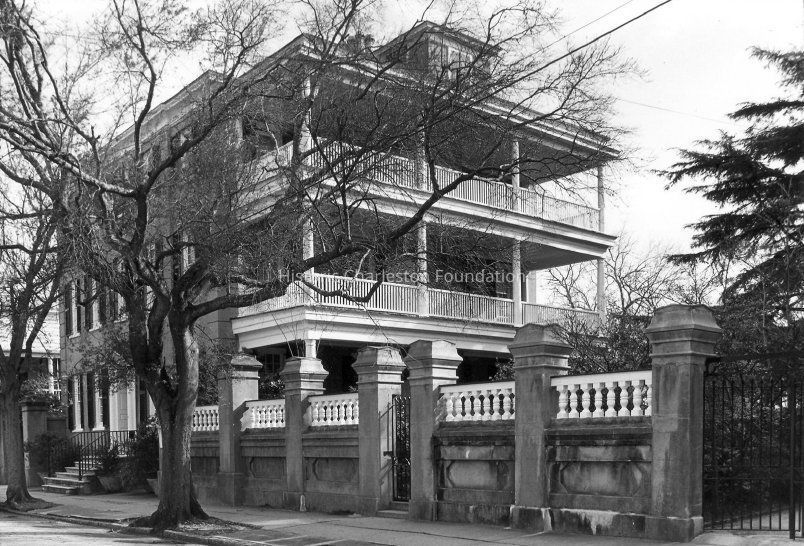 B&W photograph of the Daniel Elliott Huger House (34 Meeting Street), corner view showing the west (front) and south (piazzas) elevations.