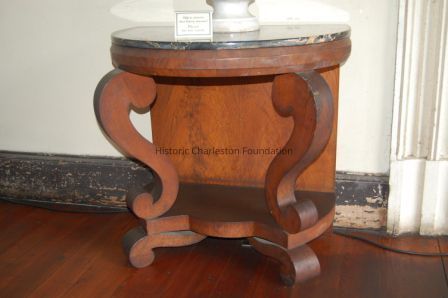 In the Empire style, this pier table has a demilune top supported in front by two scroll-shaped legs, rectangular in cross-section, which attach to a lower shelf. The lower shelf is shaped like a demilune with a portion of hte front cut out and is supported by two scroll-shaped feet in front and tapered bracket feet in back. The top is supported in back by a panel of crotch-figured oak and ash veneer. A small drawer slides out from the right side apron.Collection