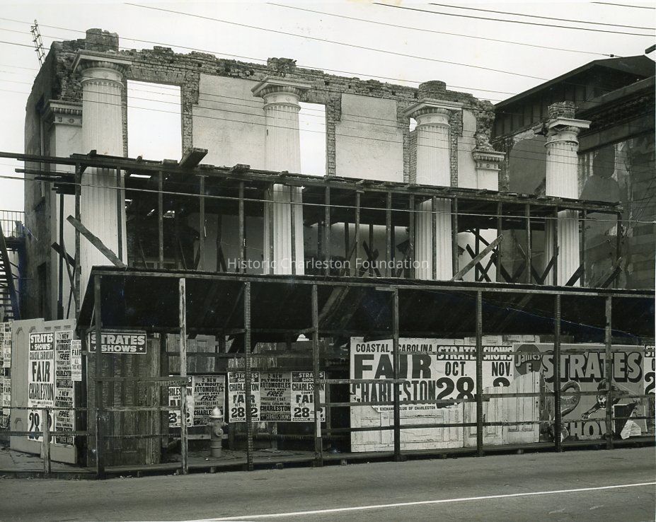 a: Street (east) elevation showing the partially demolished building. Columns are prominent. The pedestrian safety walkway is in front of building and plywood barrier. Edges of neighboring buildings on either side also in view (137 East Bay, 141 East Bay).