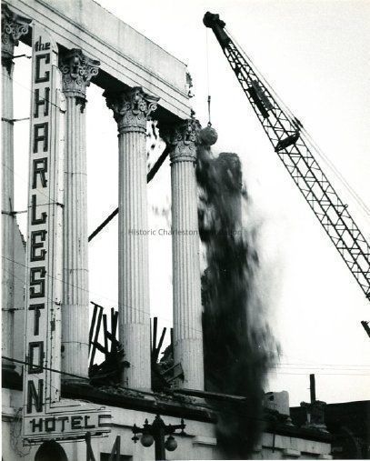 B&W photograph showing the demolition of the Charleston Hotel in progress.Collection