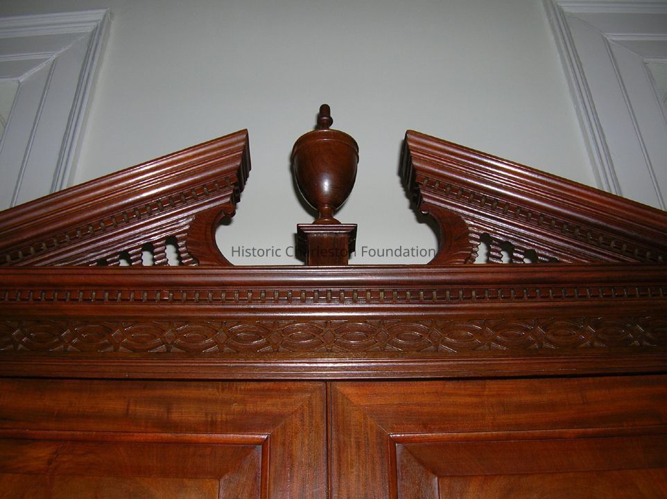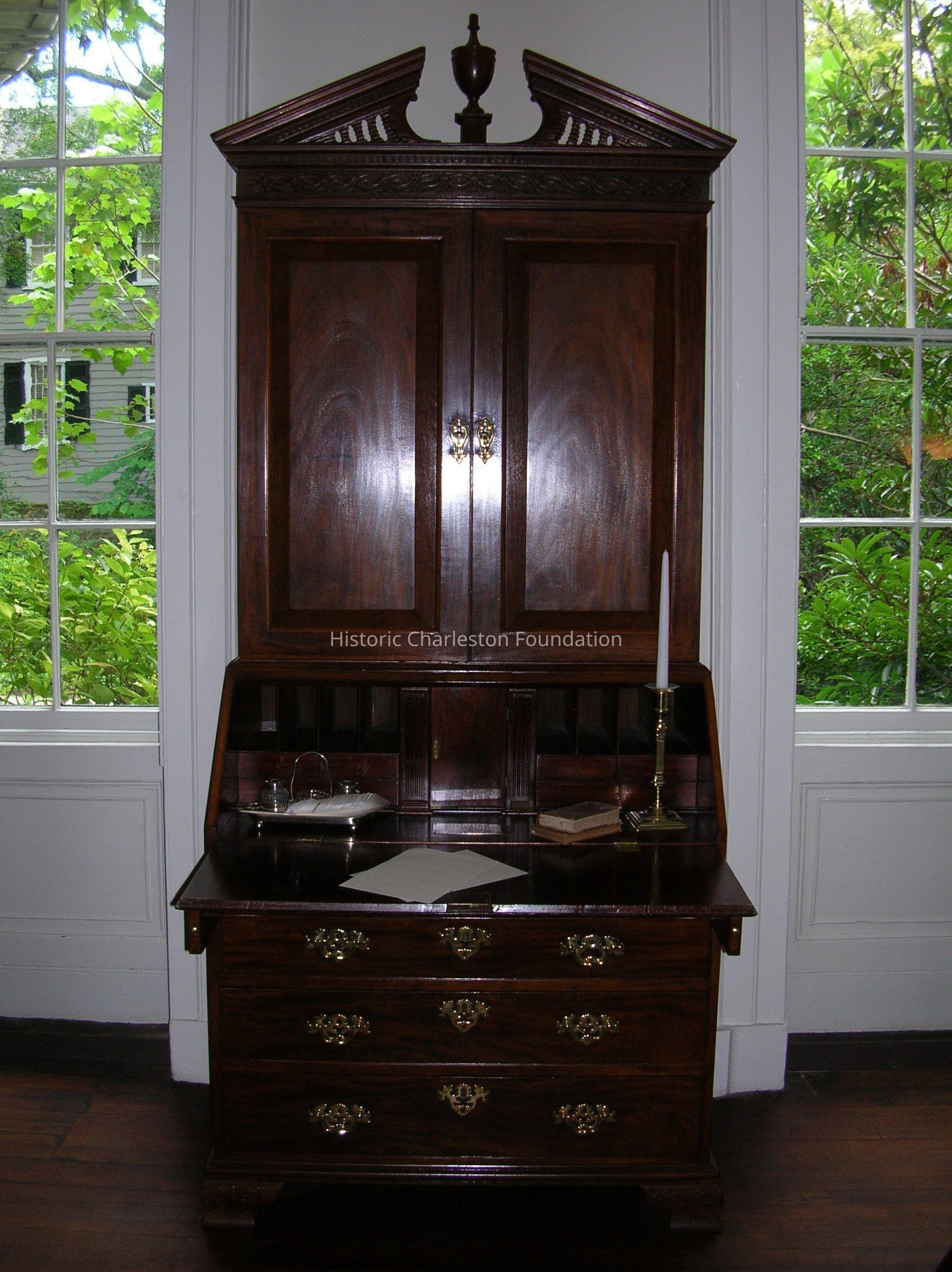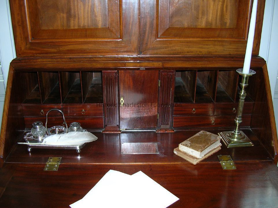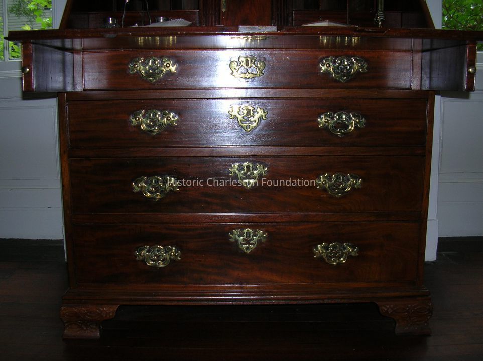 Lower section: Sloping outer front of desk has an approx. 2" inlay or cross banded piece on three sides which is mitred at corners. Brass escutcheon is similar to that of three or four lower drawers. Sloping piece has three dark marks clustered on right hand lower side. Top edge of slope has missing piece on left side and missing piece on right hand side where edge of slope joins the desk- both are noticeable. Slope has two brass hinges. When slop front is open, rear of desk is divided into three sections with center locking space having small brass escutcheons. Inside this is one drawer with brass ring pull. This small door has unusual inner brass hinges. Right hand stile on outer edge center space has obvious missing piece on right side and bottom edge. Each sitle has double-stopped fluting. On each side of center cabinet are four pigeon holes and one wide drawer with two shorter drawers above - each with brass ring pulls. Flat surface of inner desk has brass inscribed donor plate regarding gift of piece to South Carolina Society. The four drawers below the desk sections are of graduated depth with top drawer slightly shorter than the others to allow for pull-out rests to hold slope front. Each drawer has two elaborate brass pulls and center brass escutcheon. Slope front and first drawer escutcheon are similar; three lower drawers have more elaborate ones. Cabinet and bookcase has over-all blemishes and gouge marks due to age.Collection