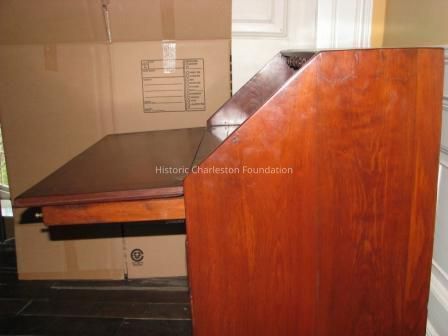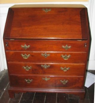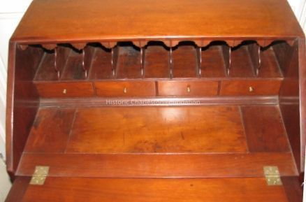 American desk, 20th century, having rectangular top over slant front, when opened reveals a center drawer flanked by a series of stacked and graduated drawers which are not original, fitted with slides, lower section having three long drawers, over molded base above shaped apron, on cabriole legs.Collection