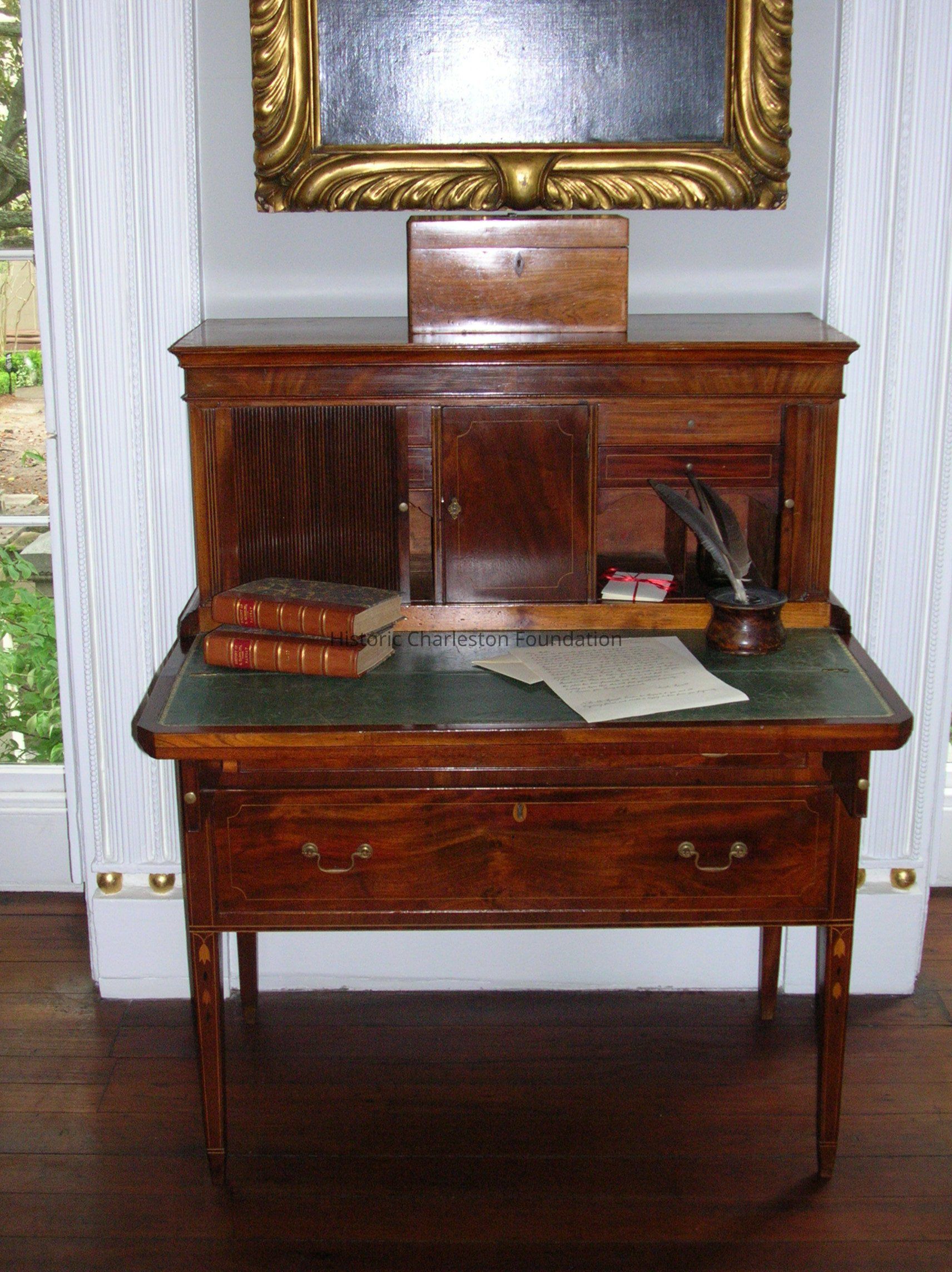 Writing surface: leather very scratched; gilt edge intact; exterior of writing surface has surface scratches, particularly on right, about midway in front of tambour and near the left edge.