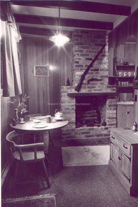 B&W photograph of the small kitchen and dining area of what has been identified as 63 Anson Street (Susan Robinson Dependency). Features small table set for two, fireplace, rifle and gun hanging over fireplace.Collection