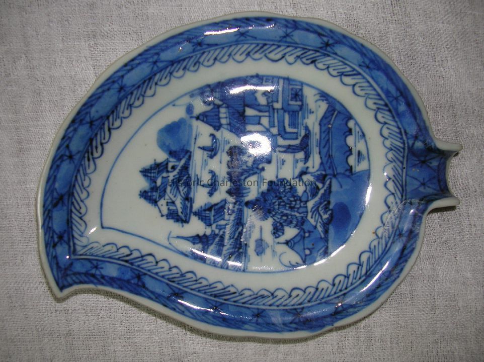 Intricately decorated underglaze blue leaf-form dish in Canton design with rain and cloud border