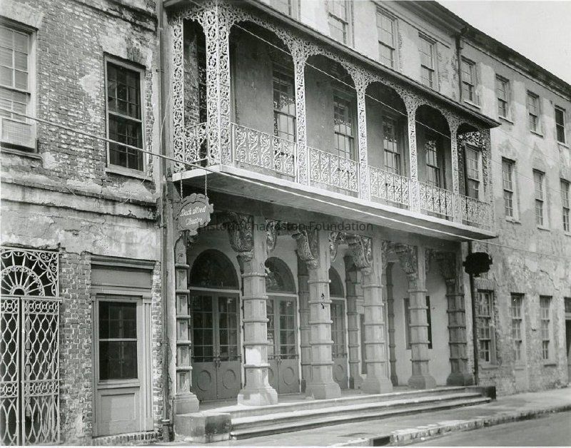 Two copies of photo in sleeve. Description of Dock Street Theater taped to back of second copy: "The Dock Street Theatre, on the site of one of America's first playhouses. The facade, which features a handsome cast-iron balcony in a morning glory pattern and sandstone columns with rare carved mahogany capitals and cornices, is that of the Old Planter's Hotel built here shortly after 1800. the Dock Street Theatre combines the preservation of the hotel and the reconstruction of an early Georgian theater. Performances are given at the Dock Street Theatre throughout the year."Collection