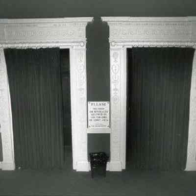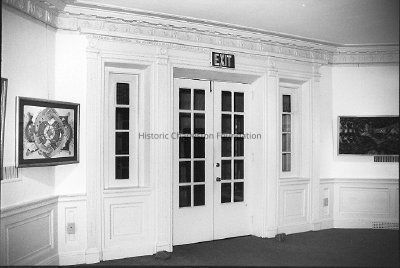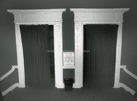 Thirty-two B&W photographs of the interior of the Dock Street Theater. Includes shots of the staircase, ceiling medallion, cornices, doors and doorways, fireplaces and mantels, lobby, and windows, and close-up details of architectural ornamentation.Context