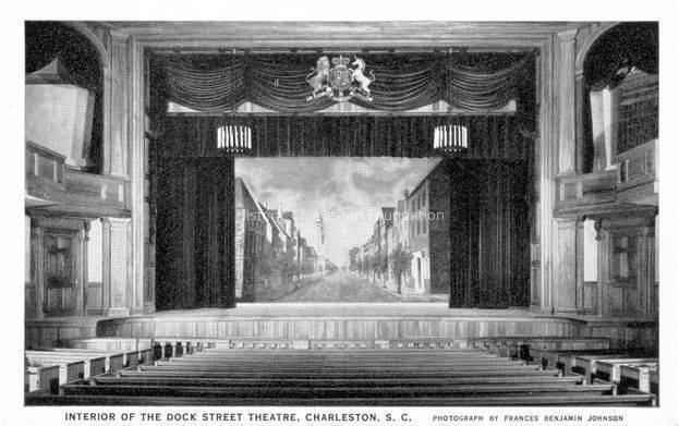 B&W photographic postcard of the interior of the Dock Street Theater (135 Church Street).Collection
