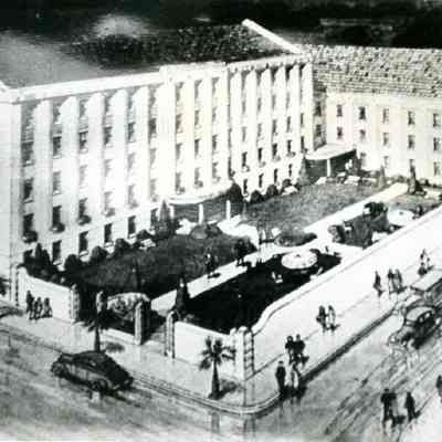 #5: Photographic reprint of the artist's rendering of Chicco Apartments, ca. 1943.Context