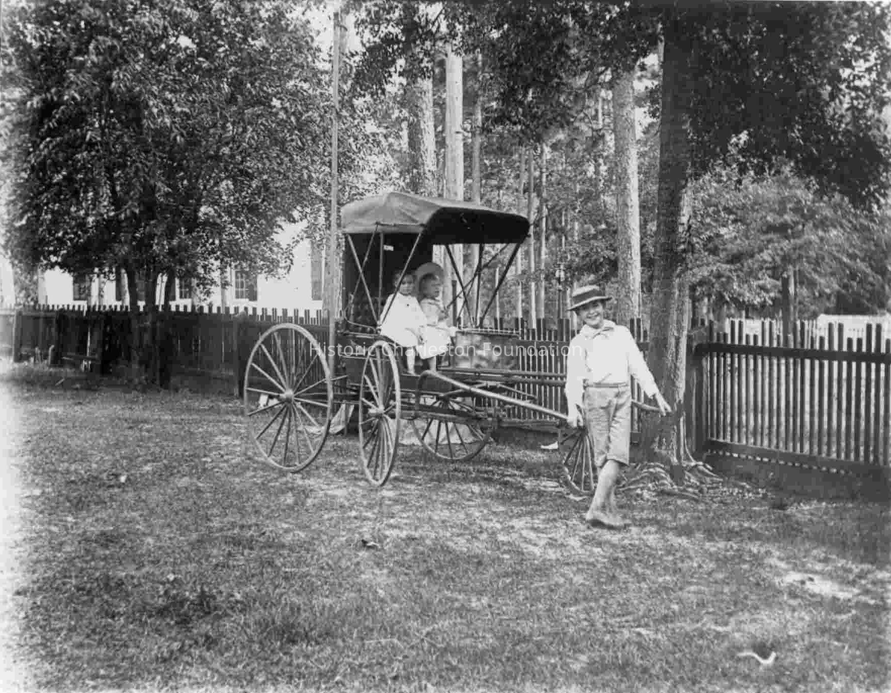 A young boy is pulling a small buggy with two children seated in it. They are in a yard by a fence. Photo is originally identified as Don and Frances in buggy in Summerville with Augustine pulling them, 7/01.Collection