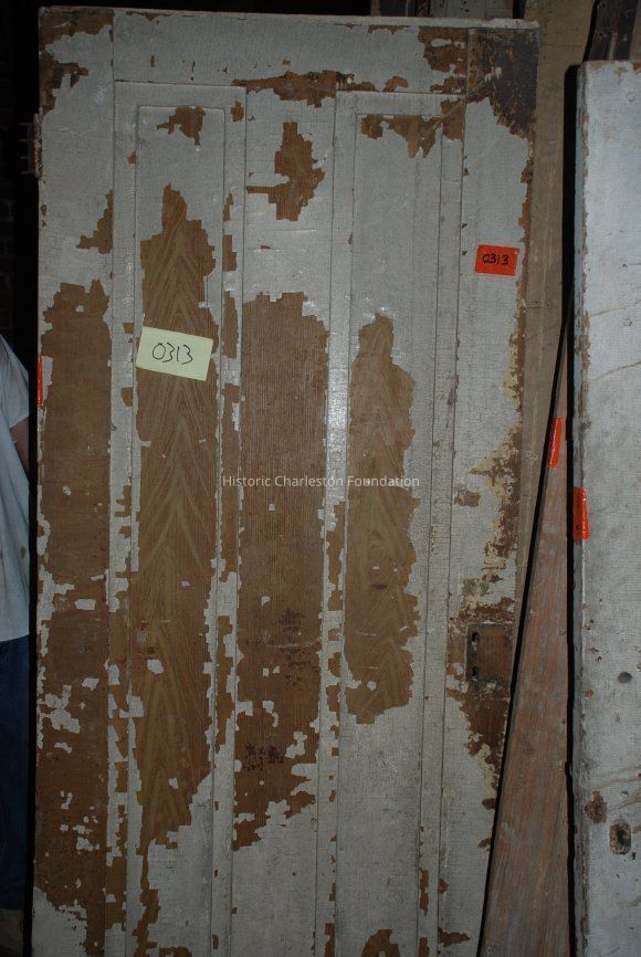 Faux graining shows through the paint layers on this two flat paneled door. It also had original cast iron hinges and is part of the Study Collection.Collection