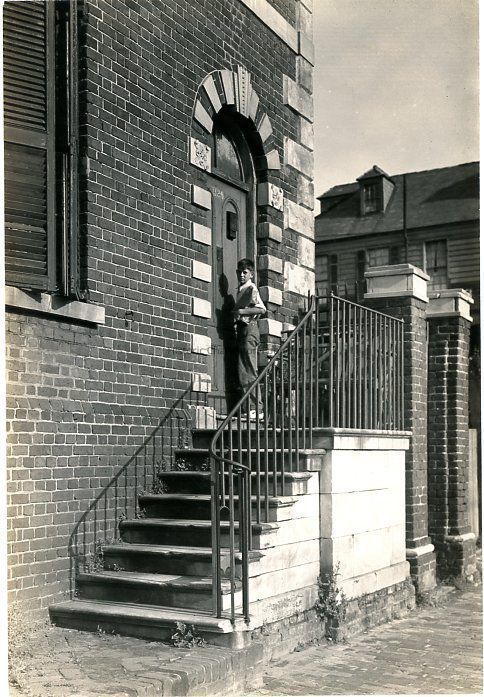 B&W photograph of the front door and doorsteps of the Gadsden-Morris House (329 East Bay Street). A boy stands at the door, looking at the camera.Collection